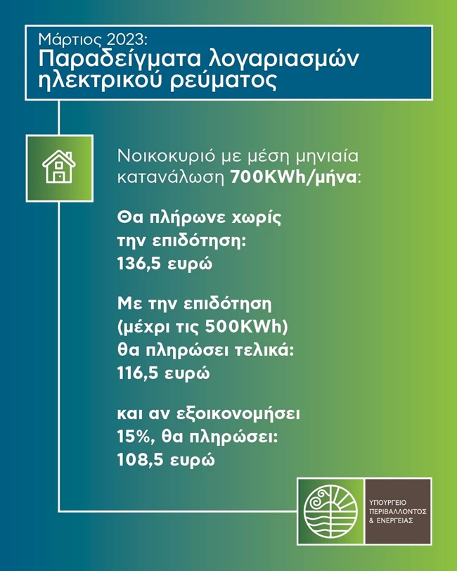 -Για κατανάλωση 400 κιλοβατώρων, ένα νοικοκυριό θα πλήρωνε τον Μάρτιο χωρίς την επιδότηση, 78 ευρώ και θα πληρώσει τελικά 62 ευρώ.