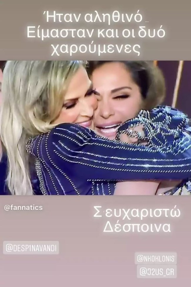 Η Άννα Βίσση δημοσίευσε μια κοινή τους φωτογραφία στα instagram stories από τη σφιχτή αγκαλιά που έκαναν πάνω στη σκηνή, γράφοντας χαρακτηριστικά: "Ήταν αληθινό και είμαστε και οι δυο χαρούμενες! Σ΄ευχαριστώ Δέσποινα".