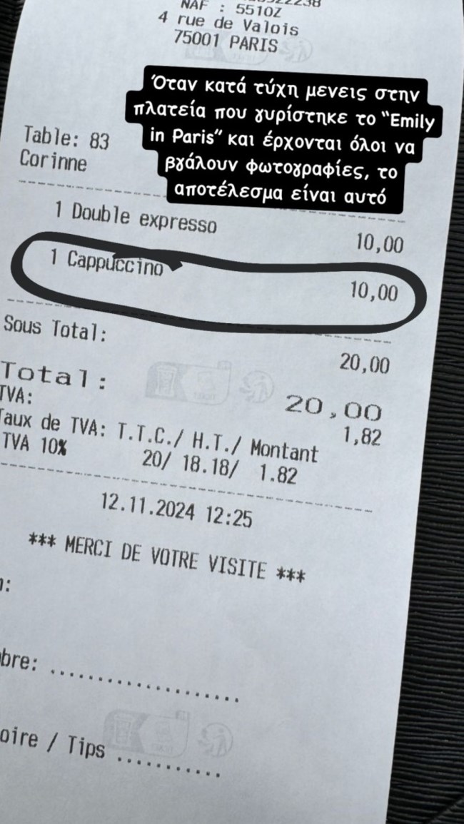 Η δημοσιογράφος και παρουσιάστρια πόσταρε μια φωτογραφία στο Instagram από την εξόρμησή της στη γαλλική πρωτεύουσα κι έδειξε τους διαδικτυακούς της φίλους την απόδειξη, καθώς έδωσε 10 ευρώ για έναν καπουτσίνο, ενώ ίδια τιμή έχει και ο διπλός espresso.