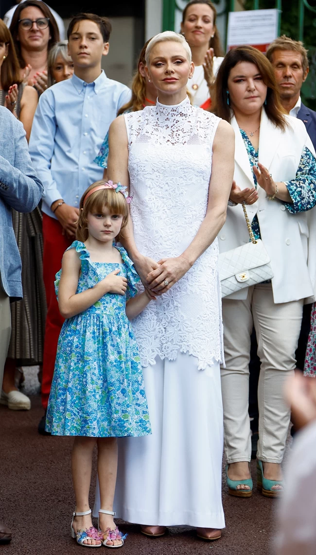 Το παλάτι δημοσίευσε στιγμιότυπα από την άφιξη της οικογένειας στο προαύλιο, όπου η Σαρλίν ήταν και πάλι υπέροχη.