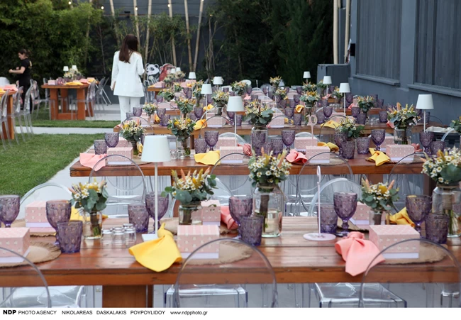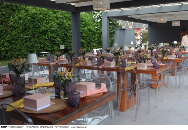 Η διακόσμηση του χώρου ήταν σε παστέλ αποχρώσεις με καλοκαιρινά άνθη, ενώ πάνω στα τραπέζια υπήρχαν τα κουτιά με τις μπομπονιέρες και πολύχρωμες υφασμάτινες πετσέτες.