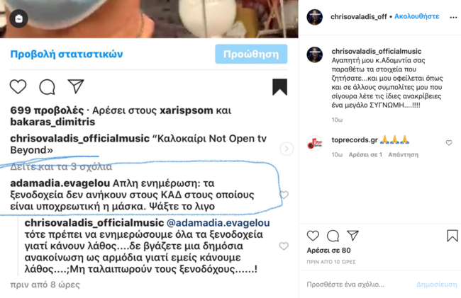 Ο δημοφιλής τραγουδιστής αναφέρθηκε μέσα σε όλα, εκ νέου, στην πρόσφατη κριτική που έκανε μέσω διαδικτύου σε ξενοδοχειακή μονάδα που δέχθηκε τον Αντώνη Ρέμο ως πελάτη δίχως να φοράει, στους εσωτερικούς χώρους, προστατευτική μάσκα που είναι πλέον απαραίτητη για την πανδημία του κορονοϊού.