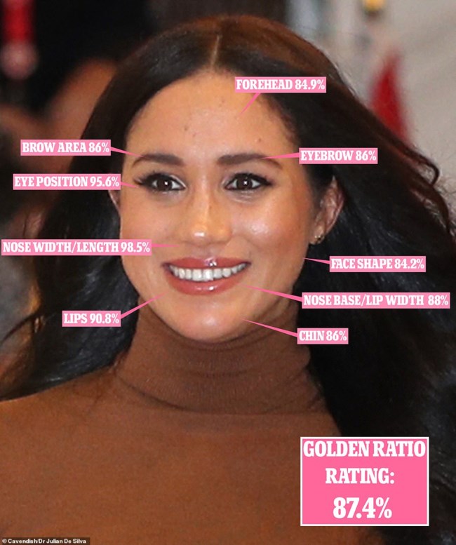 Η Μέγκαν Μαρκλ συγκέντρωσε βαθμολογία 87,7% και ήρθε στην τέταρτη θέση. Ξεχώρισε χάρη στην "όμορφη συμμετρία του προσώπου της", σημείωσε ο γιατρός, ενώ πρόσθεσε ότι έφτασε "πιο κοντά από οποιαδήποτε άλλη πριγκίπισσα στο να έχει αυτό που οι Έλληνες θεωρούσαν το τέλειο πρόσωπο".