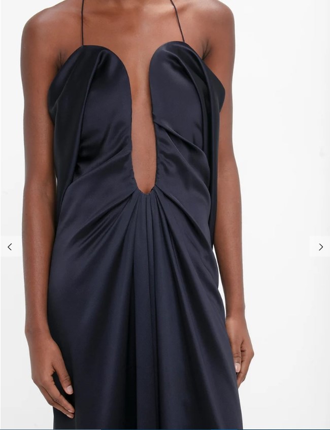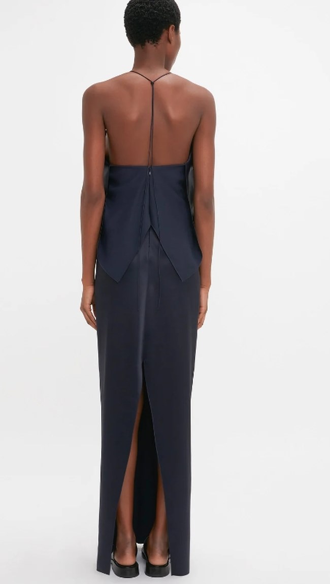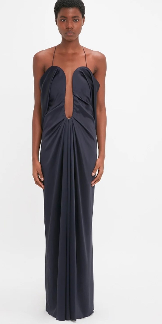 Συγκεκριμένα επέλεξε ένα navy blue μάξι φόρεμα με framed ντεκολτέ. Το ρούχο ανήκει στη συλλογή της Victoria Beckham. Πρόκειται για το Frame Detail Cut-Out Cami Dress σε navy blue.