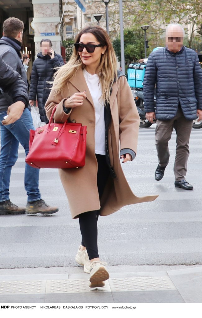 Συγκεκριμένα φόρεσε ένα αθλητικό κολάν, ένα λευκό τοπ, ένα καμηλό παλτό και σνίκερς. Αλλά το item που έσπασε τη μονοτονία ήταν η κόκκινη Hermes τσάντα της.