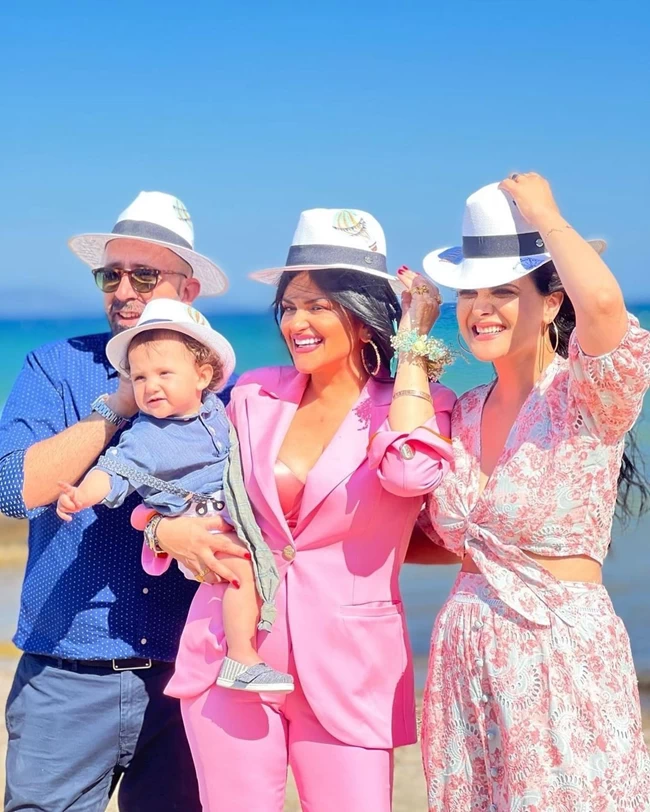 Μαζί με τους γονείς και τον νεοφώτιστο πόζαραν μπροστά στη θάλασσα φορώντας τα λευκά καπέλα τους.