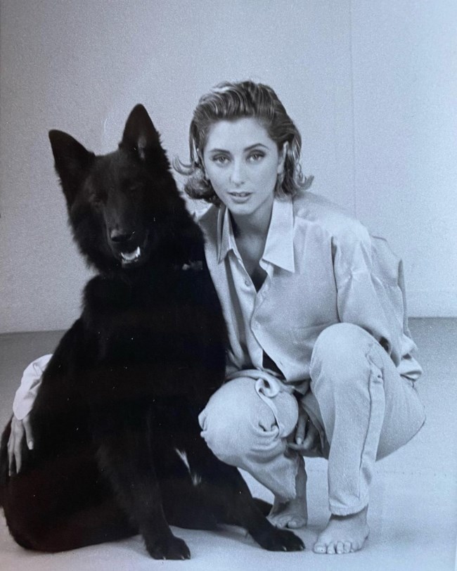 Σε άλλο στιγμιότυπο η Σαντάλ ποζάρει με τον υπέροχο μαύρο σκύλο της, σε μια εντυπωσιακή φωτογραφία όπου είναι ξυπόλητη, με ανοιχτόχρωμο denim παντελόνι και σατέν πουκάμισο ενώ τα μαλλιά της είναι χτενισμένα προς τα πίσω τονίζοντας τα μάτια της.