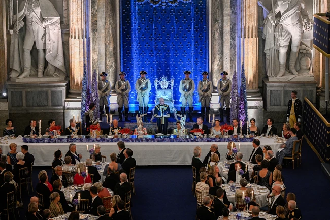Το δείπνο στο παλάτι ήταν μεγαλοπρεπές με ασημένια κηροπήγια, πλούσια λουλούδια και εντυπωσιακό φωτισμό.
