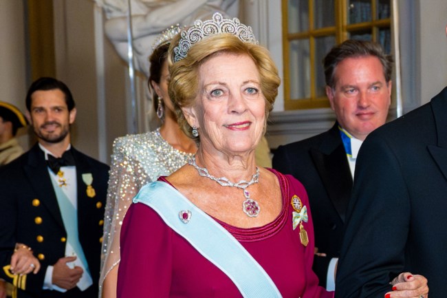 Στο επίσημο δείπνο στο παλάτι, η Άννα Μαρία ήταν υπέρλαμπρη και αριστοκρατική με μια εντυπωσιακή burgundy δημιουργία, με την υπογραφή Celia Kritharioti που ήταν εφαρμοστό στη μέση, και σε κλος γραμμή. Το συνδύασε με τα πανάκριβα ιστορικής αξίας κοσμήματά της και την τιάρα της. Τη συνόδευσε ο εστεμμένος πρίγκιπας Χάακον της Νορβηγίας.