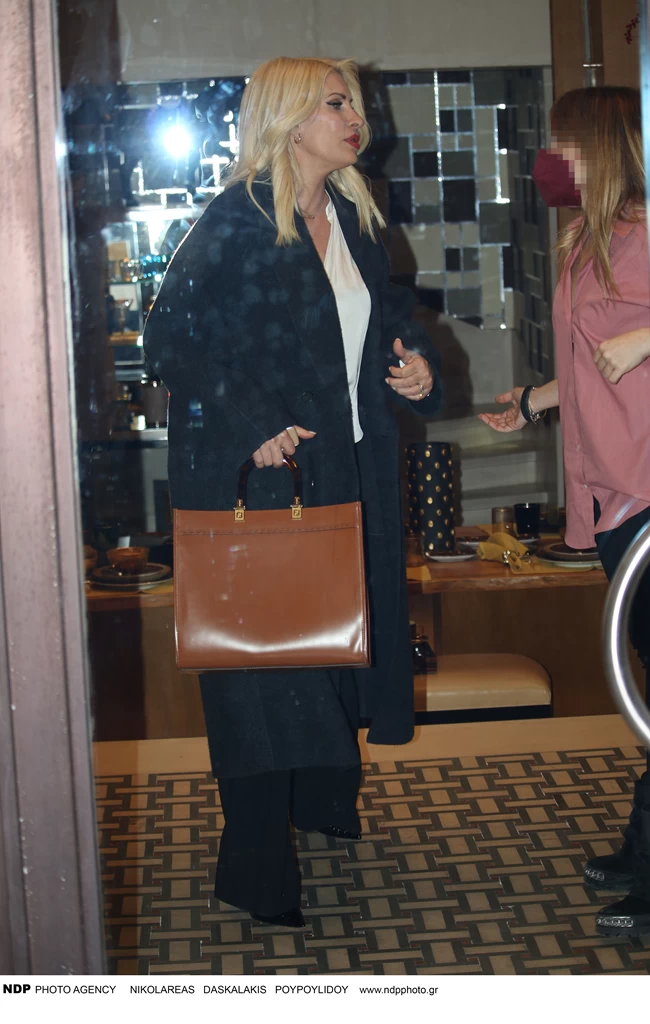Για αυτή την απογευματινή εμφάνιση, η Μενεγάκη φόρεσε μαύρο παντελόνι, λευκό πουκάμισο και άνετο μαύρο παλτό. Τα μαλλιά της ήταν ισιωμένα με λίγα σπασίματα.