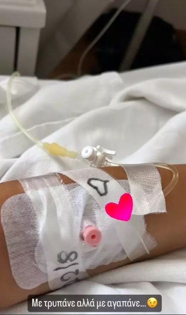 Δείχνοντας το χέρι της με τον ορό, έγραψε "με τρυπάνε αλλά με αγαπάνε".
