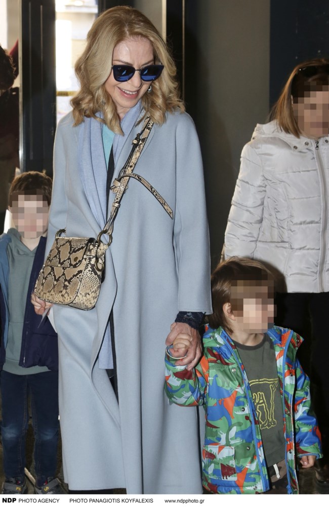Για την έξοδο με τους εγγονούς της η Έλλη Στάη φόρεσε ένα γαλάζιο παλτό και κράτησε μια snakes skin τσάντα.