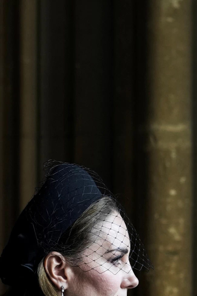 Όσο για την κηδεία της βασίλισσας στο Αββαείο του Γουέστμινστερ, η Κάθριν υιοθέτησε ένα αριστοκρατικό πένθιμο look, φορώντας ένα καπέλο με φαρδύ γείσο και ένα λεπτεπίλεπτο πέπλο που κάλυπτε όλο το πρόσωπό της, αλλά χωρίς να το κρύβει τελείως.
