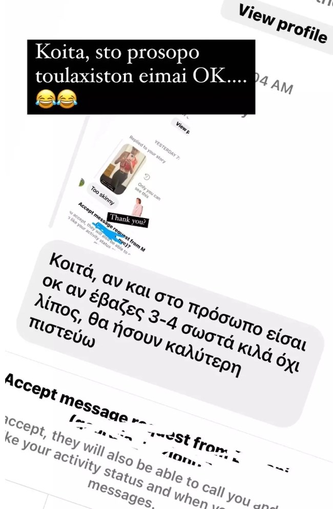 Κλείνοντας την ημέρα, η ίδια θέλησε να δημοσιεύσει και ένα θετικό σχόλιο που έλαβε και αφορά το body shaming το οποίο δεν γίνεται μόνο στους ανθρώπους που έχουν περισσότερα κιλά, αλλά και σε αυτούς που είναι πολύ αδύνατοι. Ωστόσο, ο κόσμος δεν συνειδητοποιεί ότι και αυτό είναι body shaming.