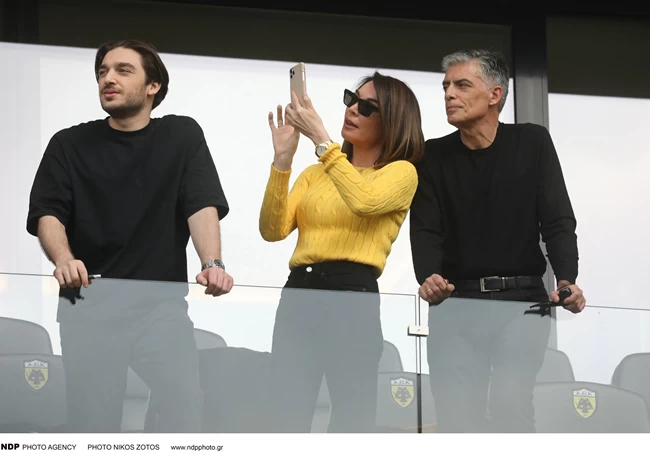 Ο Ευαγγελάτος και ο γιος του Νικόλας παρακολουθούσαν το ματς και η Τατιάνα Στεφανίδου τους φωτογράφιζε ασταμάτητα.