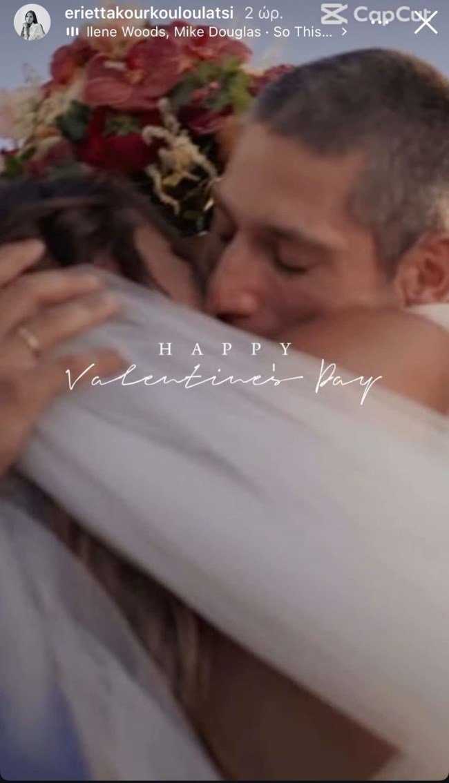 Ημέρα του Αγίου Βαλεντίνου και η Εριέττα Κούρκουλου μοιράστηκε ένα υπέροχο βίντεο που επί της ουσίας αποτελεί συρραφή στιγμών με τον σύζυγό της, Βύρωνα Βασιλειάδη. Το βίντεο ξεκινά με ένα παθιασμένο φιλί που ανταλλάσσουν την ημέρα του γάμου τους, μετά από το μυστήριο που έγινε στη Μύκονο, καθώς στο χέρι του Βύρωνα Βασιλειάδη διακρίνεται η χρυσή βέρα του.
