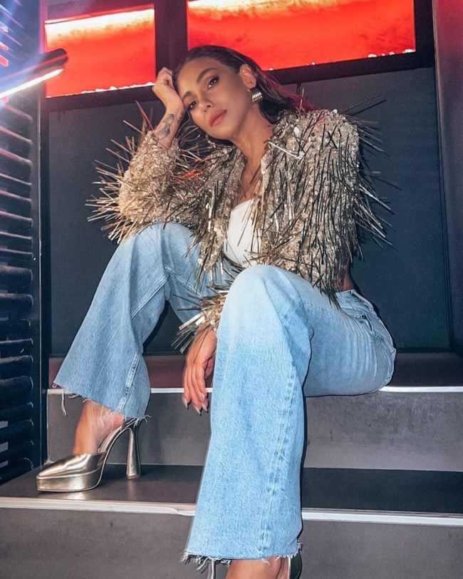 Συγκεκριμένα φόρεσε ένα ψηλόμεσο denim παντελόνι, με λευκό crop top και ένα μπολερό με χρυσές λεπτομέρειες.