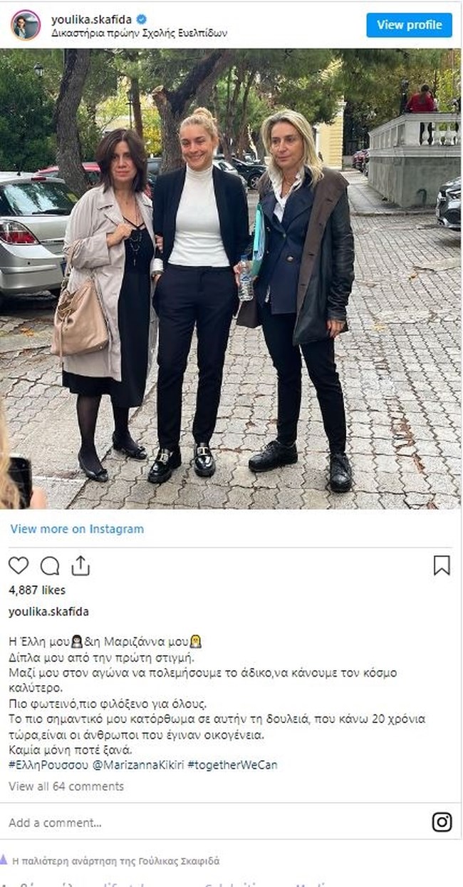 Παρόμοια φωτογραφία είχε ανβάσει και στο παρελθόν γράφοντας "Η Έλλη μου & η Μαριζάννα μου. Δίπλα μου από την πρώτη στιγμή. Μαζί μου στον αγώνα να πολεμήσουμε το άδικο,να κάνουμε τον κόσμο καλύτερο. Πιο φωτεινό, πιο φιλόξενο για όλους. Το πιο σημαντικό μου κατόρθωμα σε αυτήν τη δουλειά, που κάνω 20 χρόνια τώρα,είναι οι άνθρωποι που έγιναν οικογένεια. Καμία μόνη ποτέ ξανά".