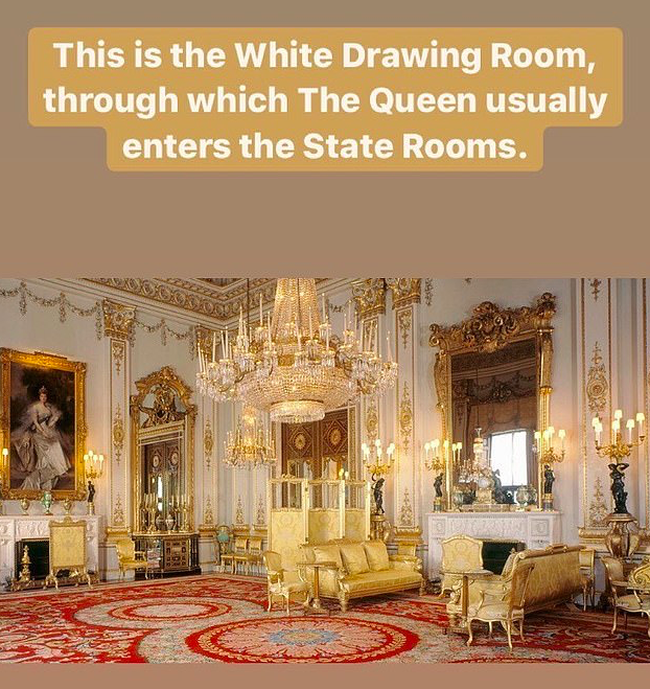 Για παράδειγμα, παρακάτω μπορείτε να δείτε το Λευκό Σαλόνι, το οποίο, ουσιαστικά, είναι μια αίθουσα για τη Βασίλισσα Ελισάβετ προτού εισέλθει στα μεγάλα δωμάτια.