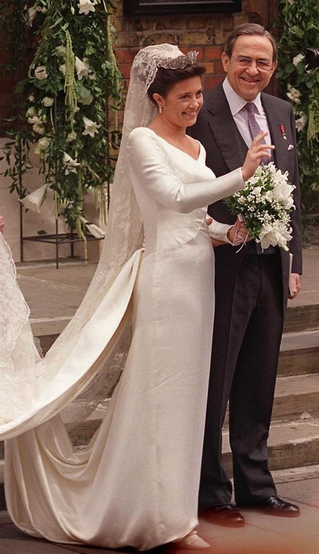 Το νυφικό της ήταν στράπλες και από πάνω φόρεσε ένα δαντελένιο μπολερό, ενώ στο κεφάλι της φόρεσε και εκείνη την τιάρα της Άννας Μαρίας.