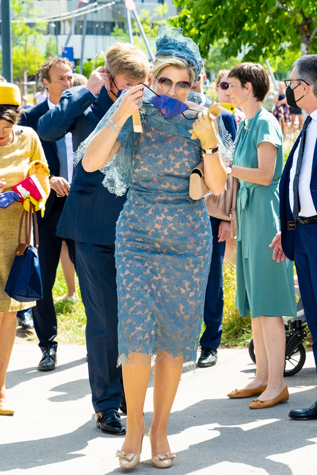 Τη δεύτερη μέρα της περιοδείας στην Αυστρία, η Μαξίμα έκανε μια επίσημη εμφάνιση με δαντελένιο one shoulder φόρεμα σε μπλε απόχρωση. Το φόρεμα είχε nude επένδυση και το συνδύασε με nude γόβες με χοντρό τακούνι και μικρό τσαντάκι.