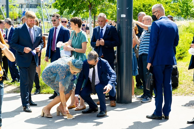 Η βασίλισσα Μαξίμα έσκυψε να πιάσει τη βεντάλια της, με τον σύζυγό της να την κοιτάζει, ενώ μόνο ένας κύριος από όσους βρίσκονταν εκεί έσπευσε να την βοηθησει. Οι υπόλοιποι στέκονταν και την κοιτούσαν.