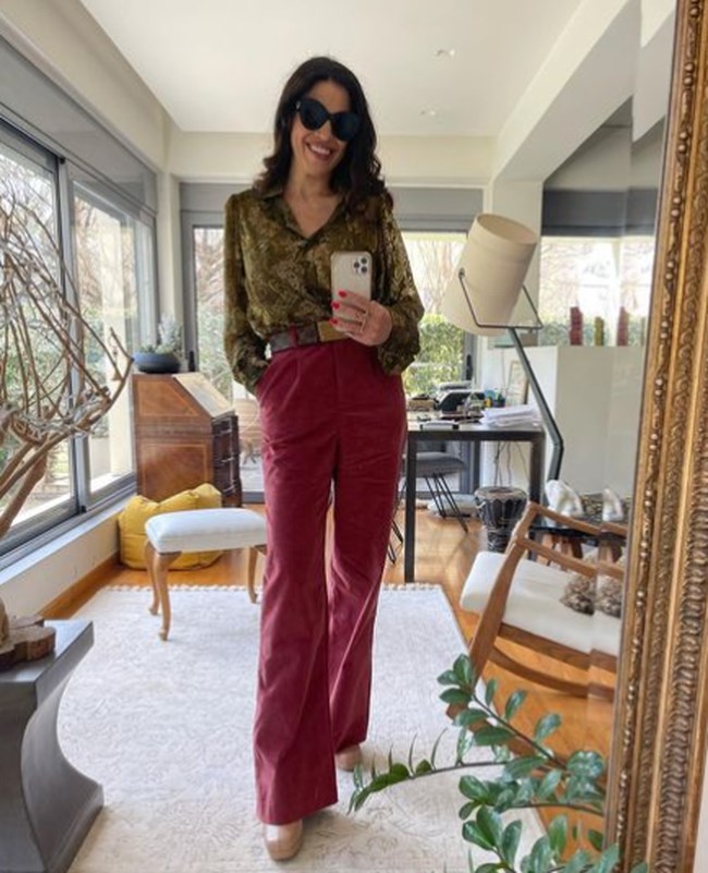 Η ηθοποιός ποζάρει "με floral διάθεση" στον χρυσό ολόσωμο καθρέφτη του σαλονιού της, στη μονοκατοικία όπου ζει με την οικογένειά της, στο Μαρούσι.