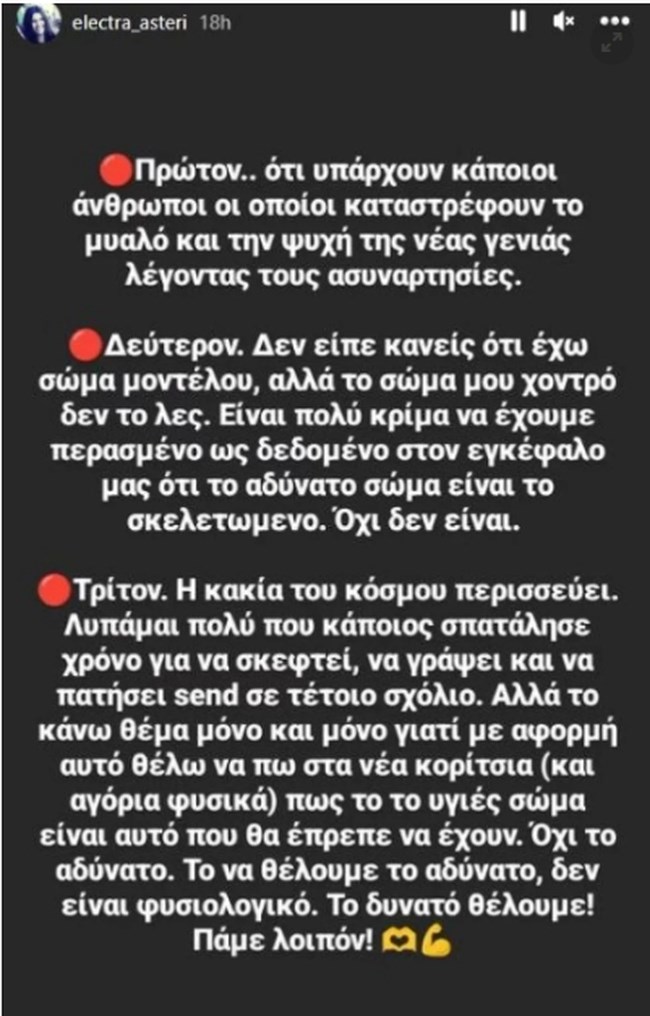 Ένα απαράδεκτο σχόλιο για την εξωτερική της εμφάνιση δέχτηκε η Ηλέκτρα Αστέρη στα social media.