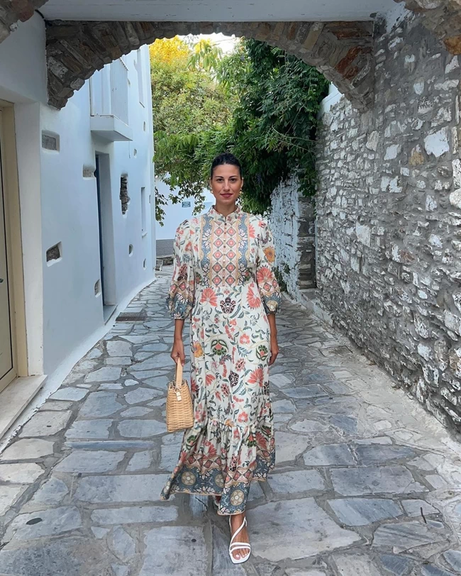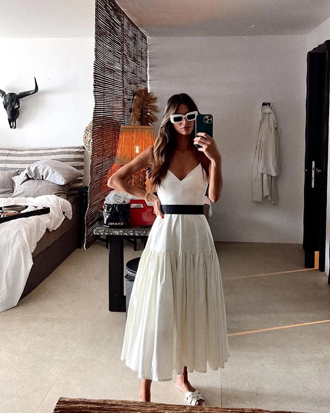 Για το πάρτι της ανιψιάς της η Ηλιάνα Παπαγεωργίου φόρεσε ένα λευκό φόρεμα με τιράντες, εφαρμοστό μπούστο και πολύ φαρδιά φούστα.