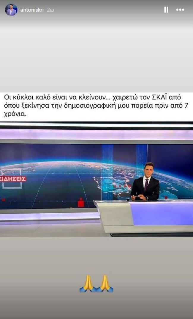 "Οι κύκλοι καλό είναι να κλείνουν… Χαιρετώ τον ΣΚΑΪ από όπου ξεκίνησα την δημοσιογραφική μου πορεία πριν από 7 χρόνια" έγραψε στα social media που διατηρεί.