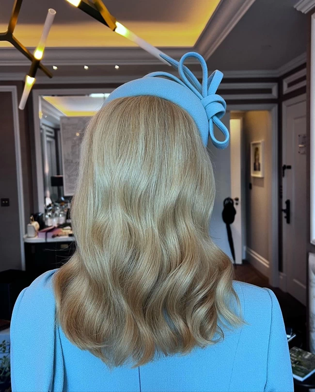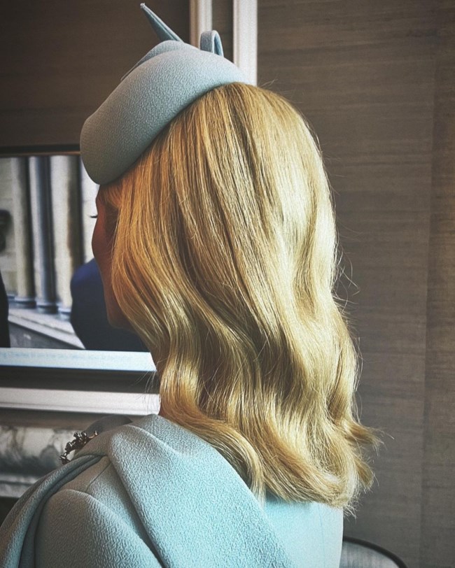 Το hairlook της επιμελήθηκε ο Ιταλός κομμωτής με έδρα το Λονδίνο Ale Franciotti δημιουργώντας ένα κομψό χτένισμα με ελαφρύ vang που ταίριαξε άψογα με το καπέλο της που ήταν κατασκευσμένο από το ίδιο ύφασμα με το φόρεμα.