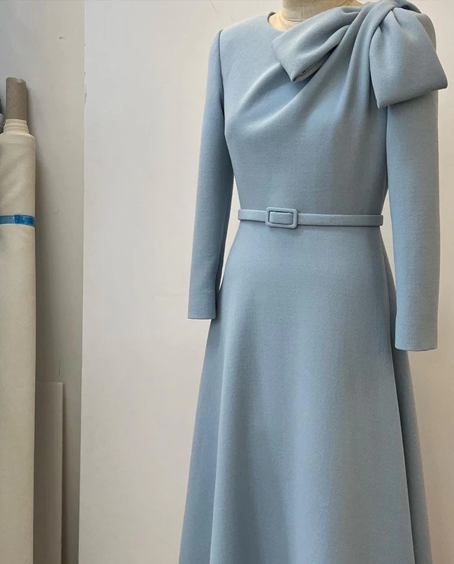Tο φόρεμα είχε έναν αποδομημένο φιόγκο στον ένα ώμο, λαιμόκοψη και λεπτή ζώνη στη μέση από το ίδιο ύφασμα.