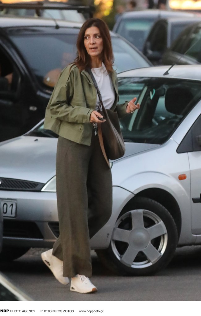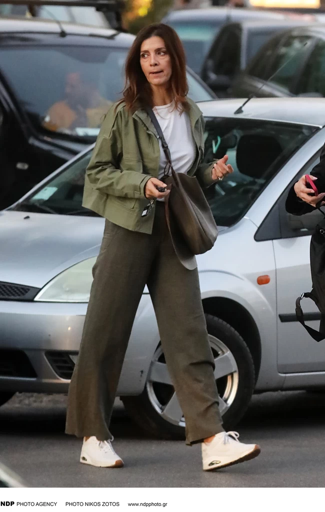 Το στοιχείο που απογείωσε την εμφάνιση ήταν το τζάκετ της σε απαλό χακί χρώμα και ταίριαζε επίσης με την τσάντα της σε χακί-καφέ χρώμα. Η Κατερίνα Λέχου ολοκλήρωσε το look με λευκά sneakers, πετυχαίνοντας το απόλυτο minimal chic look.