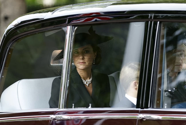 Η 40χρονη Κέιτ επέλεξε ένα κομψό πένθιμο σύνολο ενώ το μαργαριταρένιο τσόκερ που φόρεσε στον λαιμό, ήταν μέρος της προσωπικής συλλογής κοσμημάτων της βασίλισσα Ελισάβετ.