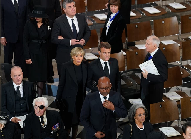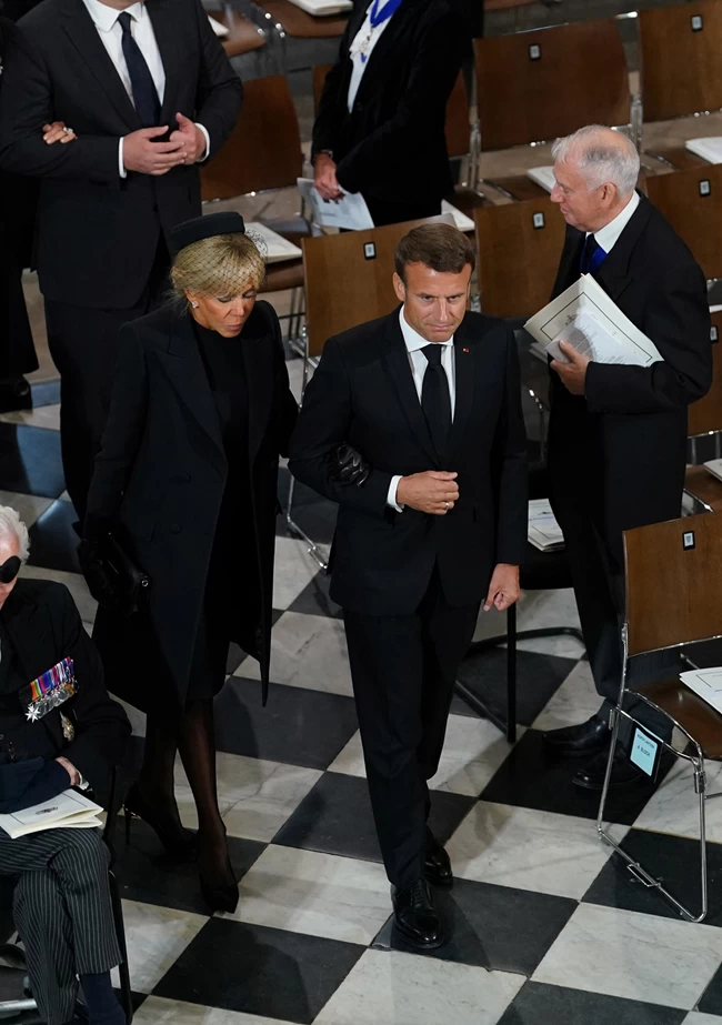 O πρόεδρος της Γαλλίας Εμανουέλ Μακρόν έφτασε μαζί με τη σύζυγό του Μπριζίτ, η οποία τήρησε το πρωτόκολλο και φόρεσε καπέλο με βέλο. H πρώτη κυρία της Γαλλίας, ήταν η επιτομή της γαλλικής κομψότητας με το μαύρο μαντό της, τις ψηλοτάκουνες γόβες της, την στιλάτη τσάντα της και τον τρόπο που φόρεσε το βέλο της. Πρόσθεσε ένα ζευγάρι μαύρα δερμάτινα γάντια.