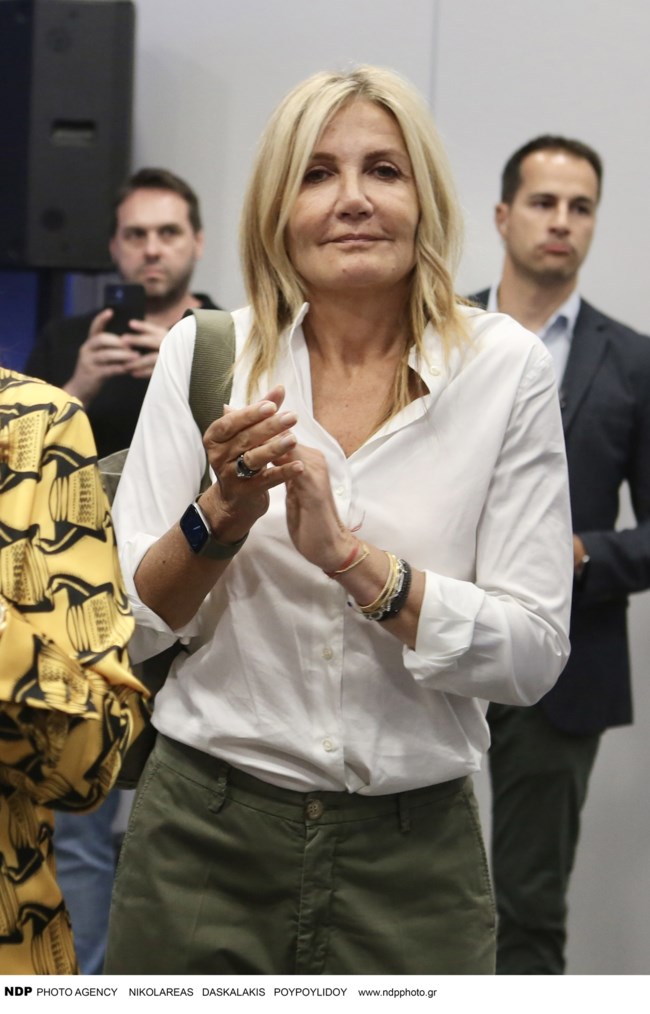 Για την απογευματινή εμφάνισή της η Μαρέβα Μητσοτάκη επέλεξε ένα λευκό πουκάμισο που συνδύασε με ένα χακί παντελόνι σε loose γραμμή με ρεβέρ.