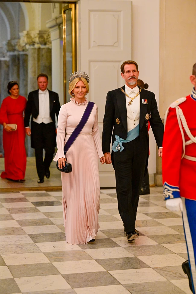 Η 77χρονη Άννα Μαρία φόρεσε για ακόμα μια φορά το μάξι μπλε φόρεμα που φόρεσε στον γάμο του γιου της Φίλιππου με τη Νίνα Φλορ, μια δημιουργία Celia Kritharioti. Το συνδύασε με την τιάρα Khedive of Egypt και εντυπωσιακά κοσμήματα.