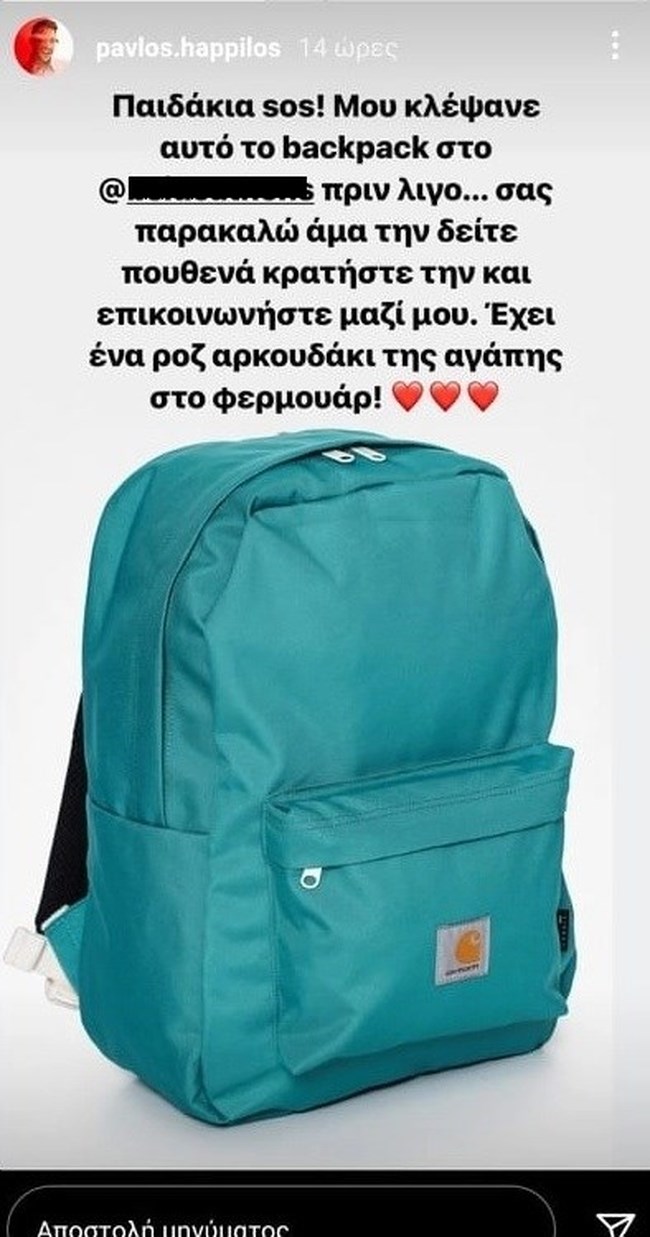 "Παιδάκια sos! Μου κλέψανε αυτό το backpack στο@bsideeathens πριν λίγο… σας παρακαλώ άμα τη δείτε επικοινωνήστε μαζί μου. Έχει ένα ροζ αρκουδάκι της αγάπης στο φερμουάρ", έγραψε στην πρώτη φωτογραφία ο Παύλος Χάπιλλος και λίγο αργότερα στη δεύτερη φωτογραφία που πόσταρε ανέφερε: