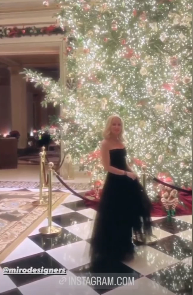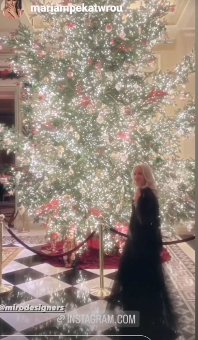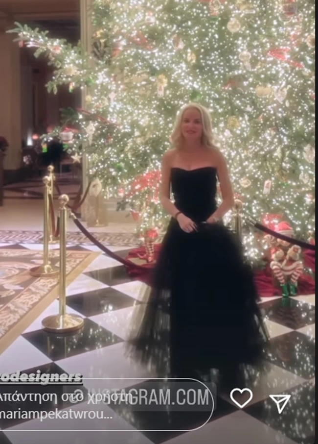 Το φόρεμά της ήταν μάξι με διαφάνειες και λεπτομέρειες από τούλι και φτερά. Η ίδια πόζαρε μπροστά από το χριστουγεννιάτικο δέντρο του ξενοδοχείου και έμοιαζε να έχει βγει από σελίδες παραμυθιού μέσα στο στράπλες φόρεμα με την τούλινη φούστα και αποσπώμενη τούλινη κάπα με φτερά.