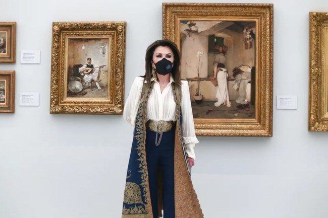 Η κυρία Αγγελοπούλου επέλεξε να φορέσει έναν ντουλαμά, αυτό το υπέροχο πανωφόρι του 19ου αιώνα. Πρόκειται για ένα μεγαλοπρεπές ρούχο που ολοκλήρωνε την εμφάνιση της εποχής.