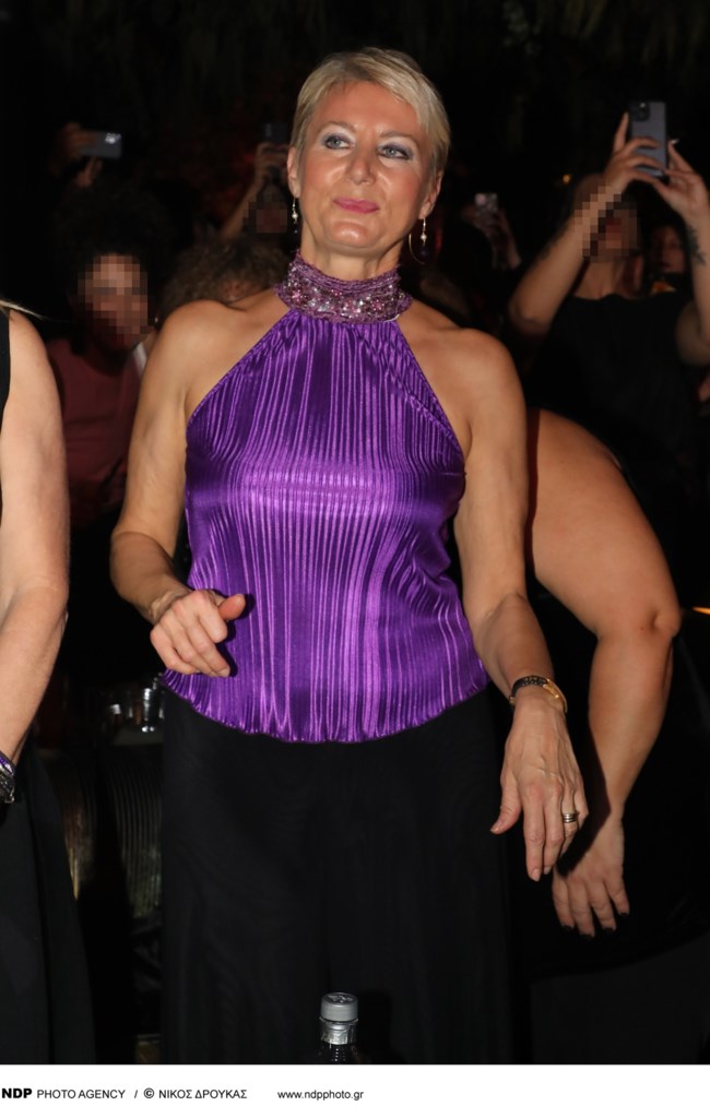 Η 56χρονη έκανε μια εντυπωσιακή βραδινή εμφάνιση με ένα πλισέ έξωμο τοπ με ψηλό λαιμό σε έντονο μωβ.