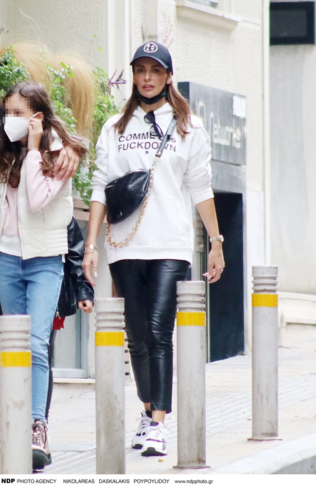Η Μαγγίρα έκανε ένα μοδάτο look με δερμάτινο παντελόνι, φούτερ και αθλητικά παπούτσια.