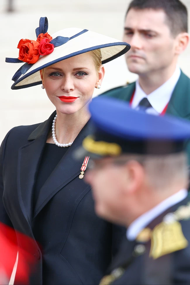 Όσο για την πριγκίπισσα Σαρλίν εμφανίστηκε ασορτί με τον πρίγκιπα Αλβέρτο, φορώντας ένα μπλε navy κοστούμι με λευκό τοπ.