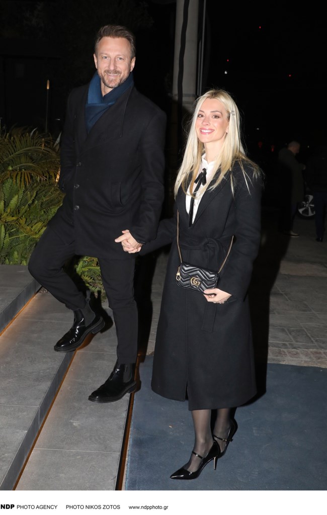 Στην κοπή της πρωτοχρονιάτικης πίτας του ΑΝΤ1 έδωσε το παρών ο Κώστας Καραφώτης με την κούκλα σύζυγό του Κάτια Μάνου. Ο ταλαντούχος τραγουδιστής και η σύζυγός του έφτασαν στο Posidonio όπου έλαβε χώρα η εκδήλωση, πιασμένοι από το χέρι. Η Κάτια Μάνου επέλεξε ένα ασπρόμαυρο σύνολο που απαρτιζόταν από ένα λευκό πουκάμισο με ένα ρομαντικό μαύρο φιόγκο, μία μαύρη φούστα και ένα ασορτί μαύρο μάξι παλτό. Το σύνολό της ολοκλήρωσε με ένα μαύρο τσαντάκι και ένα ζευγάρι stylish γόβες.