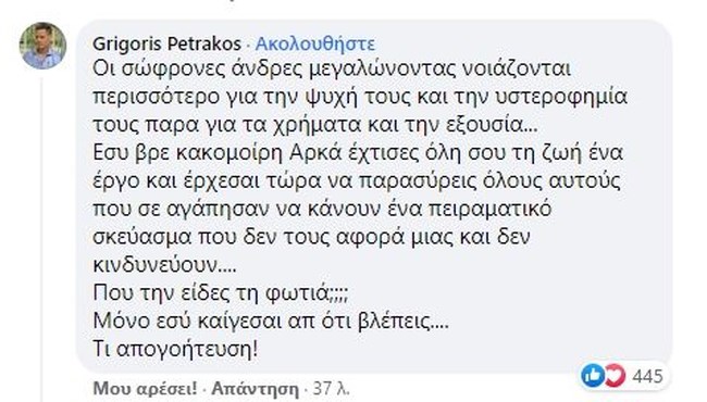 "Οι σώφρονες άνδρες μεγαλώνοντας νοιάζονται περισσότερο για την ψυχή τους και την υστεροφημία τους παρά για τα χρήματα και την εξουσία... Εσύ βρε κακομοίρη Αρκά έχτισες όλη σου τη ζωή σε ένα έργο και έρχεσαι τώρα να παρασύρεις όλους αυτούς που σε αγάπησαν να κάνουν ένα πειραματικό σκεύασμα που δεν τους αφορά μιας και δεν κινδυνεύουν... Πού την είδες τη φωτιά; Μόνο εσύ καίγεσαι απ'ό,τι βλέπεις... Τι απογοήτευση!", έγραψε ο Γρηγόρης Πετράκος.