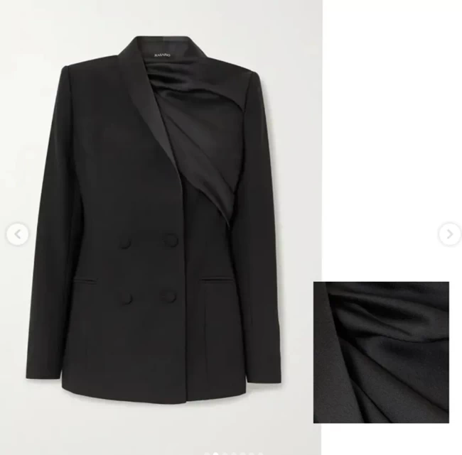 Το μπλέιζερ είναι από το brand RASARIO από κρεπ και σατέν ύφασμα, με ιδιαίτερο ντραπέ πέτο που κλείνει σαν πουκάμισο.