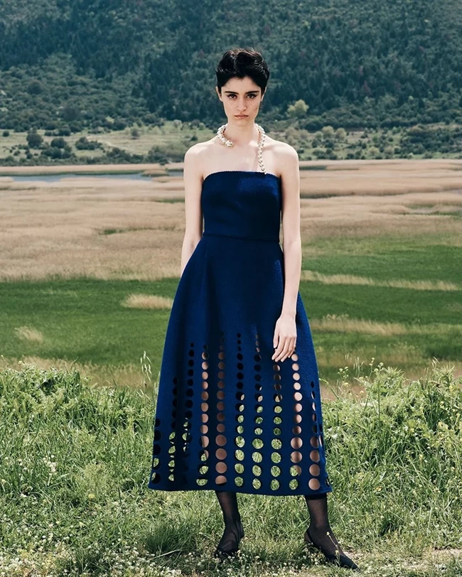 Για τη συγκεκριμένη περίσταση, η Κεφαλογιάννη επέλεξε ένα ιδιαίτερο μίντι φόρεμα της σχεδιάστριας το οποίο ήταν στράπλες και είχε λεπτομέρειες laser cut στη φούστα.