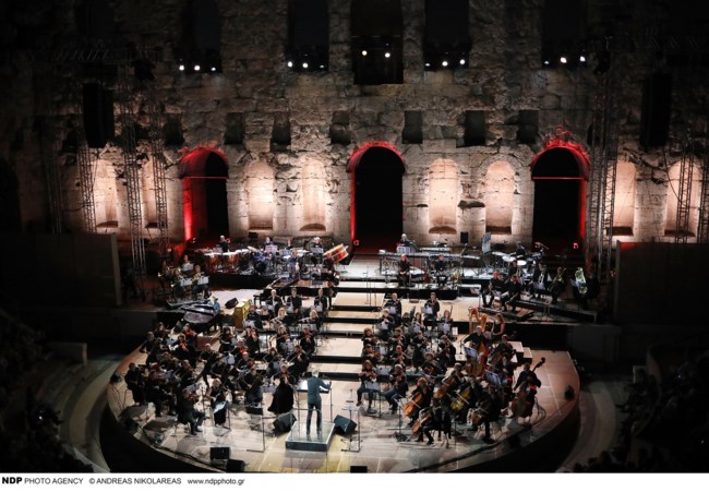 Η Όλγα Κεφαλογιάννη πήγε στο Ωδείο Ηρώδου Αττικού φορώντας ένα υπέροχο μεσάτο φλοράλ φόρεμα με μακριά μανίκια, τονισμένους ώμους και μικρά κουμπιά ντυμένα από το ίδιο ύφασμα. Το φόρεμα κατέληγε σε φαρδιά φούστα με μεγάλο άνοιγμα.