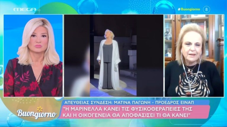 Για την Μαρινέλλα είπε πως: "κάνει τις φυσικοθεραπείες της. Από εκεί και πέρα θα αποφασίσει η οικογένειά της πώς θα διαχειριστεί σε ποιο κέντρο αποκατάστασης θα πάει". "Στην Ελλάδα είναι πολλά τα κέντρα αποκάταστασης και είναι καλά", τόνισε η Ματίνα Παγώνη.