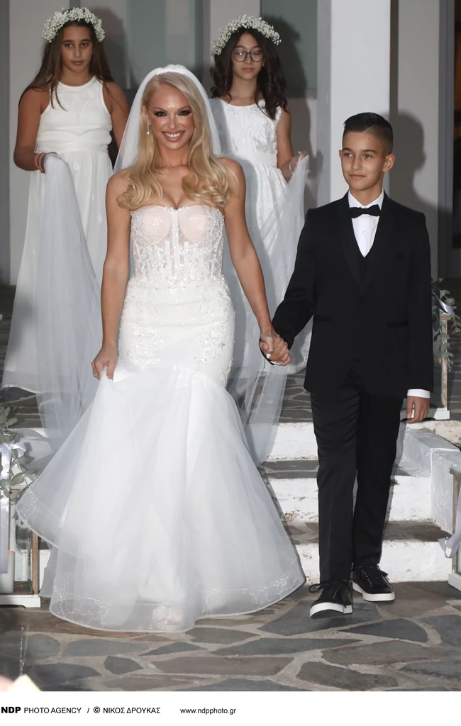Η νύφη έλαμπε μέσα στο νυφικό της σε στιλ γοργονέ που ράφτηκε αποκλειστικά για εκείνη στο Μιλάνο και επέλεξε να αφήσει τα μαλλιά της κάτω σε χαλαρές μπούκλες, ενώ επέλεξε και το μακιγιάζ της να κινείται σε γήινους τόνους.